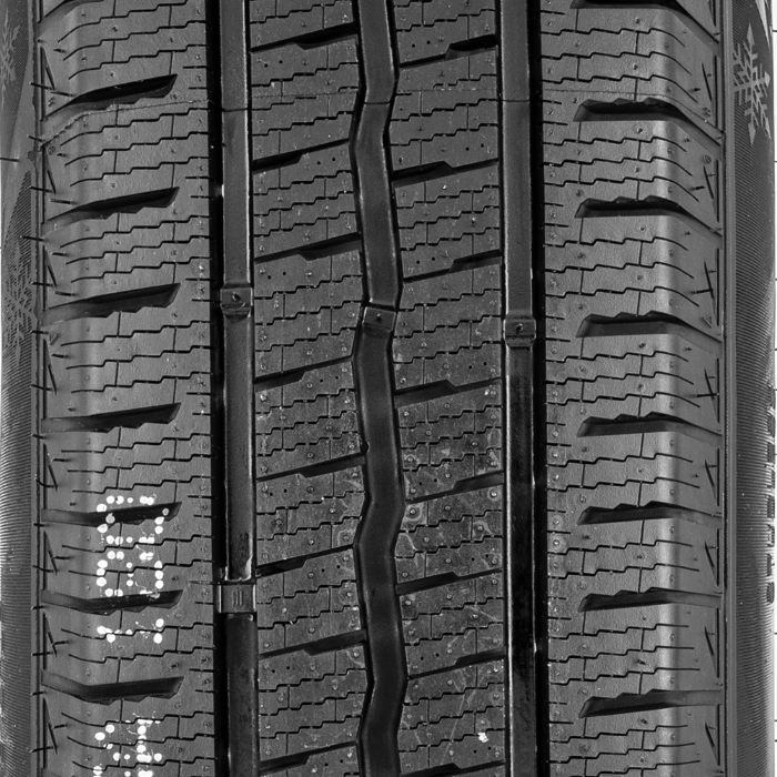 Compasal WinterBlazer VAN es ante todo un producto para condiciones de invierno, cuando en la carretera se puede acumular tanto nieve como barro o agua. Por ese motivo es tan importante un sistema adecuado de limpieza de la banda de rodadura. En este modelo son responsables de ello los anchos surcos perimetrales que transportan la suciedad que se acumula bajo las ruedas, mientras que los canales transversales perfilados evitan en bloqueo del barro en la banda de rodadura. También desempeñan un papel importante las láminas con forma ondulada, que se clavan en la nieve suelta, mejorando la adherencia de los neumáticos en las típicas condiciones invernales.